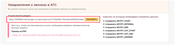 Для получения сообщения о звонках необходимо ввести сгенерированную ссылку из поля “Адрес CRM” в поле “Ссылка вашего ресурса” и нажать кнопку “Обновить”.