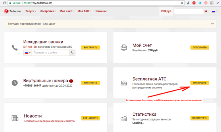 Если вкладки Моя АТС нет, то нужно активировать бесплатную АТС (кнопка “Настроить” на скриншоте)