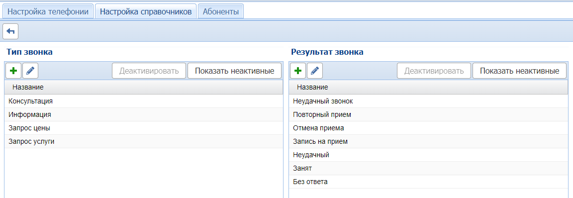 Во вкладке Настройка справочников можно добавить, отредактировать или деактивировать результаты звонка и типы звонков.