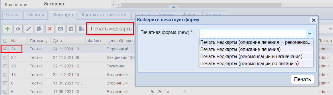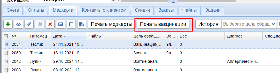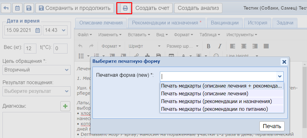 Как распечатать описание лечение или рекомендации; печать результатов анализов, информации о вакцинации питомца.