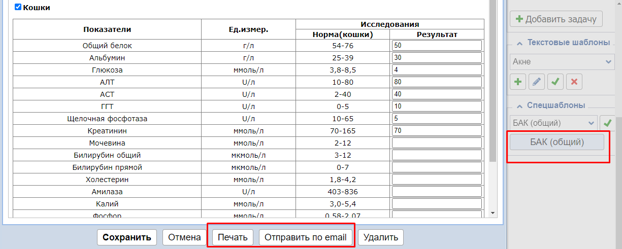 Из медкарты отдельно можно распечатать результаты анализов, заполненные в спецшаблоне. Для этого открываем карту на редактирование, нажимаем на кнопку с названием добавленного спецшаблона.