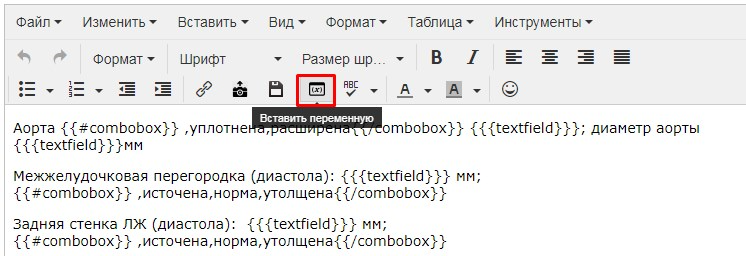Шаблон состоит из текста и переменных (они обозначены фигурными скобками). При редактировании важно не удалять части этих переменных, иначе шаблон не будет открываться в медкарте.