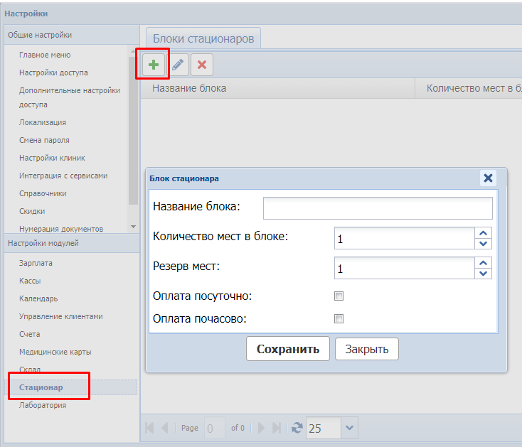 Настройки - Настройки модулей - Стационар - в данном разделе добавляются места для содержания животных в стационаре, которые будут указываться во вкладке Стационар в модуле Управление клиентами.