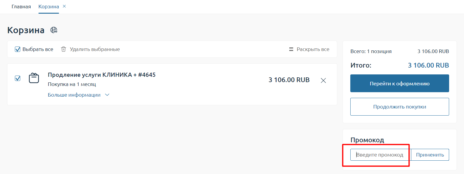 Если у вас есть купон (промокод) на скидку, то вы можете использовать его следующим образом. Перейдите в сервис оплаты программы, оформите заказ на продление тарифа и добавьте его в корзину.
