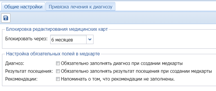 Также в этой вкладке можно установить настройку заполнения обязательных полей: диагноз, результат посещения, рекомендации. Если поставить там галочки, программа будет требовать заполнить эти поля в медкарте. Без них не даст сохранить карту.