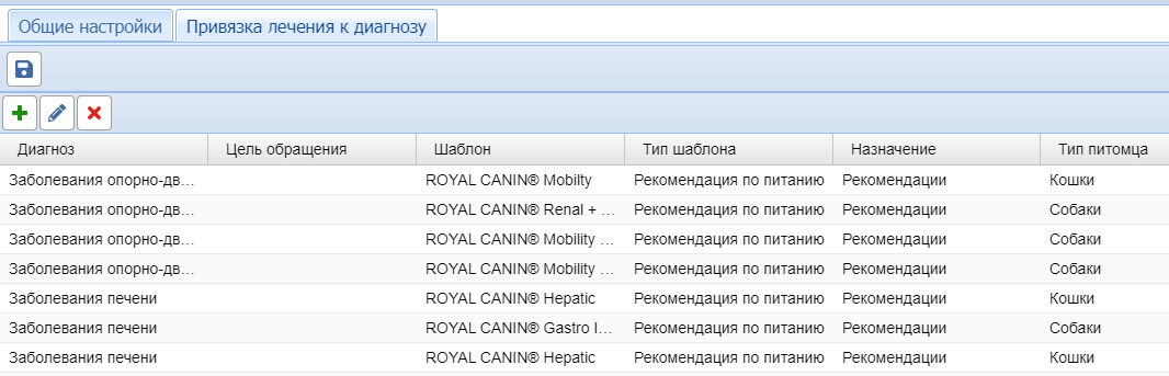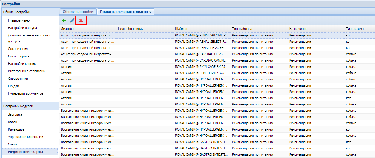 Аналогично можно настроить привязку рекомендаций по питанию к диагнозу. По умолчанию сделана привязка диагнозов к кормам Royal Canin. Если существующие привязки не нужны, можно их удалить (доступно только для доменов, которые не являются партнерами Royal Canin). В Настройки — Медкарты — Привязка лечения к диагнозу — выделить строку и нажать Удалить (красный крест).