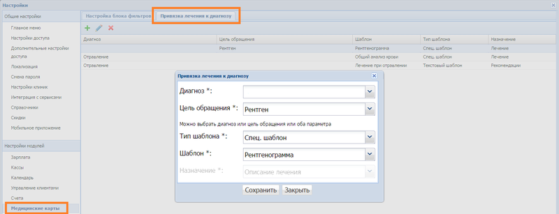 После создаем привязку в Настройки — Медкарты — вкладка Привязка лечения к диагнозу. Новые привязки создаются через кнопку Добавить (зеленый плюс)