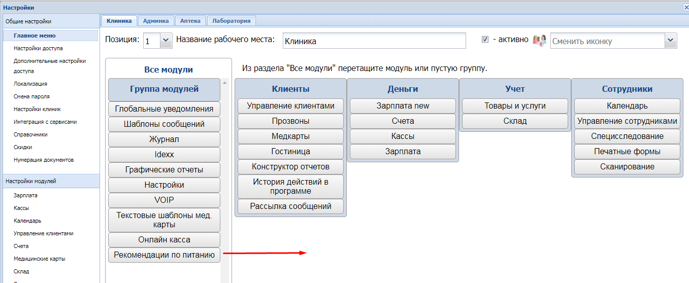Чтобы добавить привязки с другими кормами, нужно сначала добавить сами рекомендации. Переходим в настройках в Главное меню и добавляем новый модуль Рекомендации по питанию.