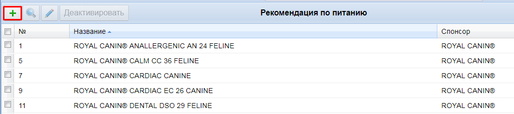 Следующий шаг — создать шаблон рекомендации. Переходим в программе в модуль Рекомендации по питанию. Неиспользуемые шаблоны можно деактивировать (доступно только для доменов, не являющихся партнерами Royal Canin). Чтобы создать новый шаблон, жмем Добавить (зеленый плюс).