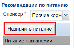 После этого в медкарте при выборе диагноза, к которому есть привязка, во вкладке Рекомендации появится звездочка-напоминание. Переходим в эту вкладку, выбираем спонсора — Прочие корма, выделяем рекомендацию и жмем Назначить питание.