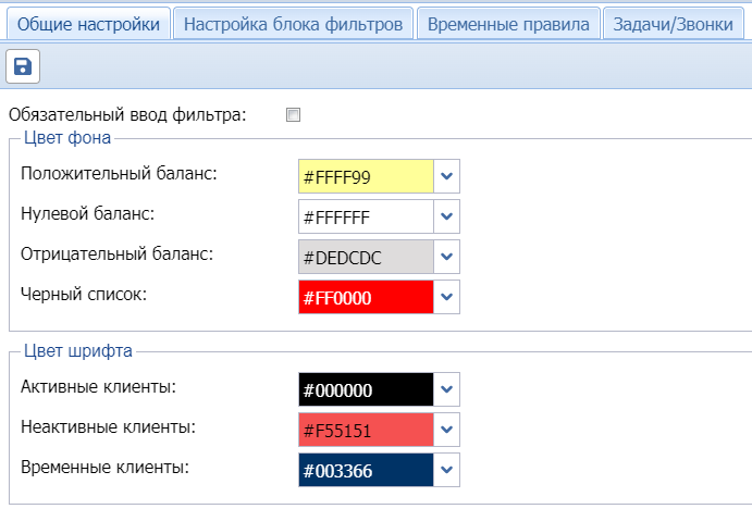 В данном разделе можно менять цвет строк в главном гриде клиентов, обозначающих состояние баланса, а также цвет шрифта активных и неактивных клиентов.