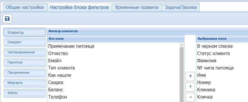 В этой вкладке можно настроить поля, которые видны в блоке фильтров. Можно убрать неиспользуемые поля или поменять расположение, перетащив выше наиболее часто используемые. Настройки сохранятся для всех пользователей.