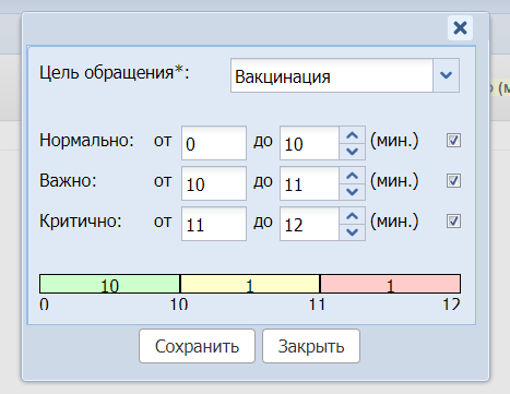 Чтобы добавить новое правило или отредактировать существующее нажмите кнопку Добавить (+), в колонке Тип приема выберите тип (цель обращения) и укажите временные границы для трех вариантов (напротив ненужного статуса можно снять чекбокс и использовать статусы только Нормально и Критично):