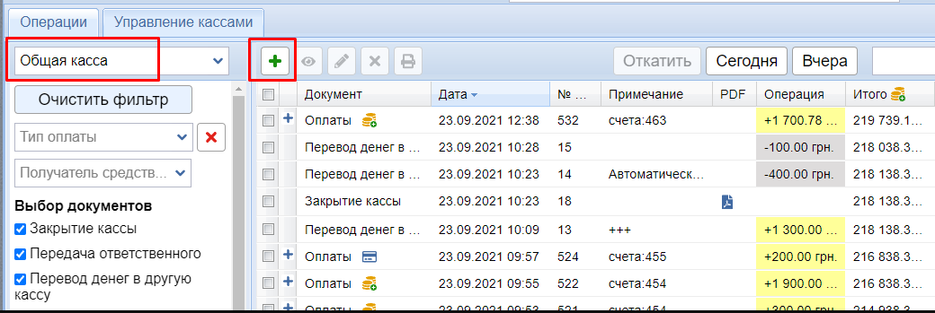 В разделе Деньги — Кассы — Операции в фильтре выбираем нужную кассу и жмем зеленый плюс.