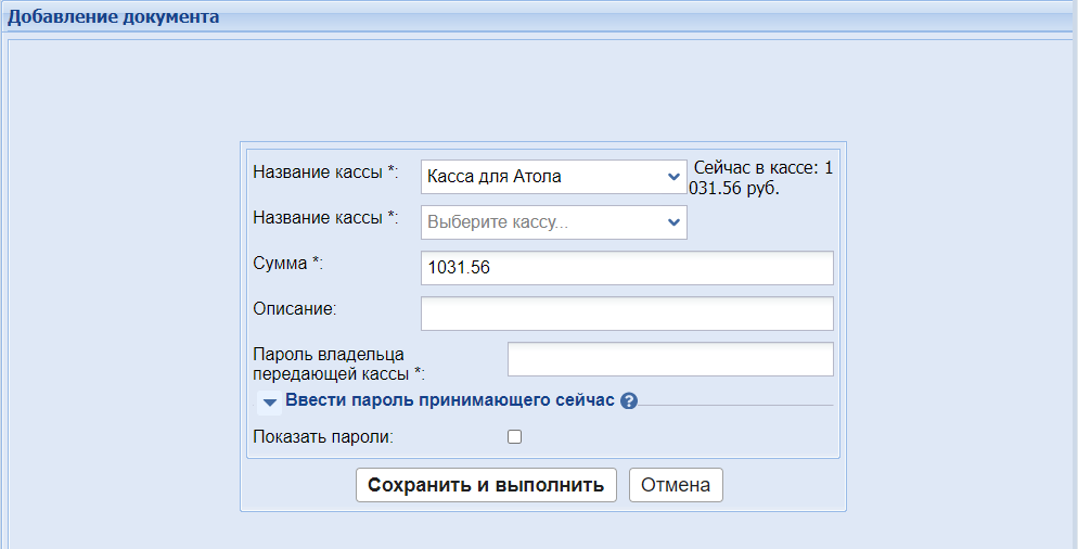 Если не ввести пароль принимающего сразу при передаче, то будет создан документ, который еще нужно принять в кассе Сейф.