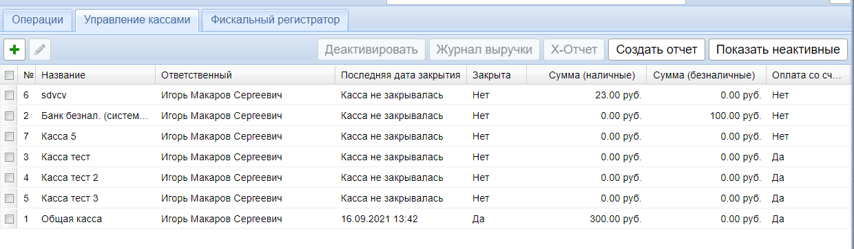• Показать неактивные — через эту кнопку можно посмотреть кассы, которые были деактивированы.