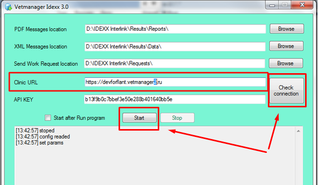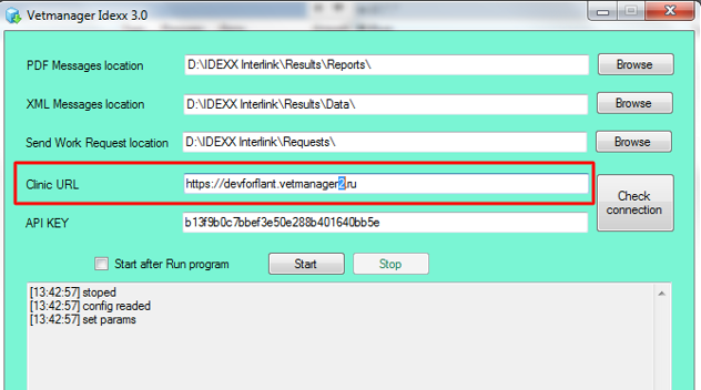 1. Запустите клиент Vetmanager Idexx. Нажмите кнопку Stop, если она активна.