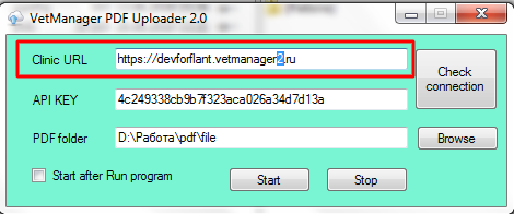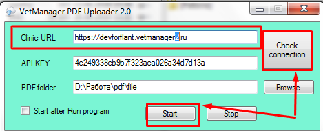 Запустите VetManager PDF Uploader | Замените адрес | Check connection |