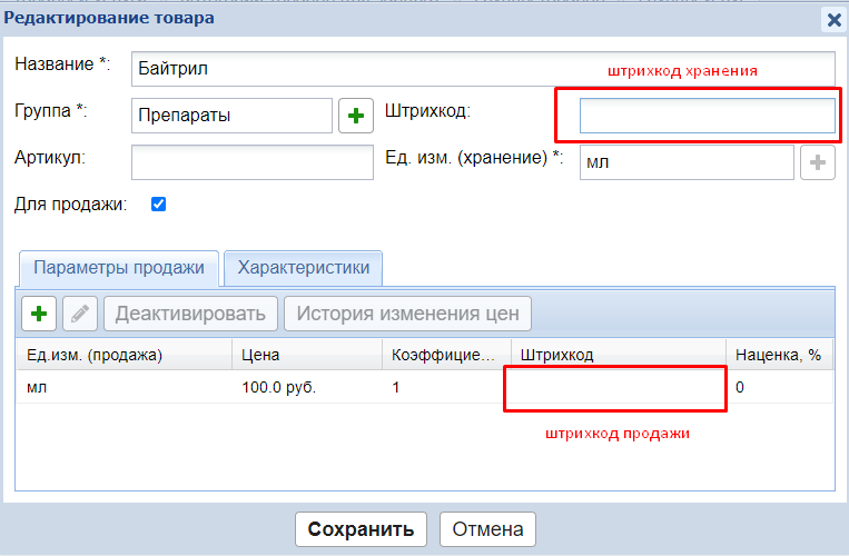 В карточке товара есть два поля для штрихкодов (так как штрихкоды хранения и продажи могут отличаться):