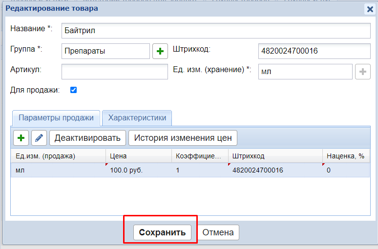 Сохраняем карточку товара с заполненными штрихкодами. После этого данный товар можно будет найти по штрихкоду в складе и в счетах.