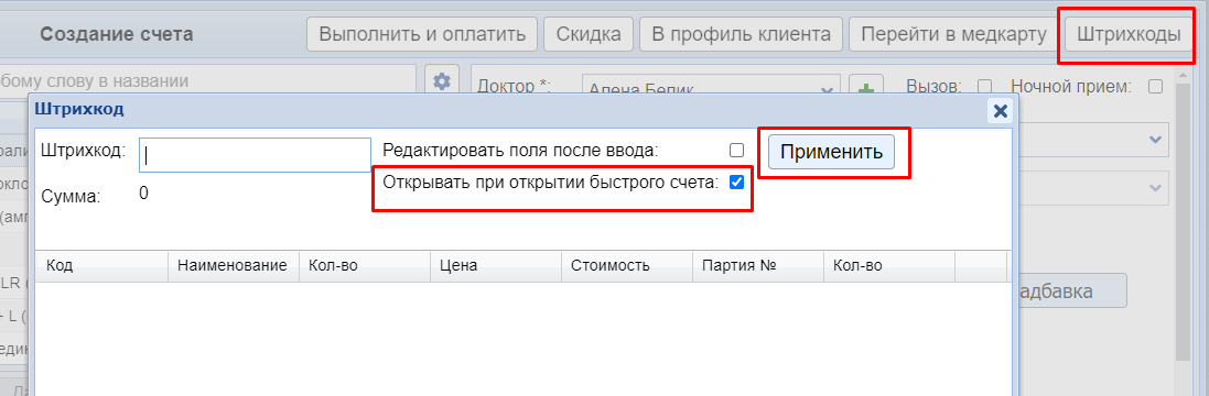 В нем можно настроить автоматическое открытие окна для сканирования штрихкодов — поставить галочку Открывать при открытии быстрого счета.
