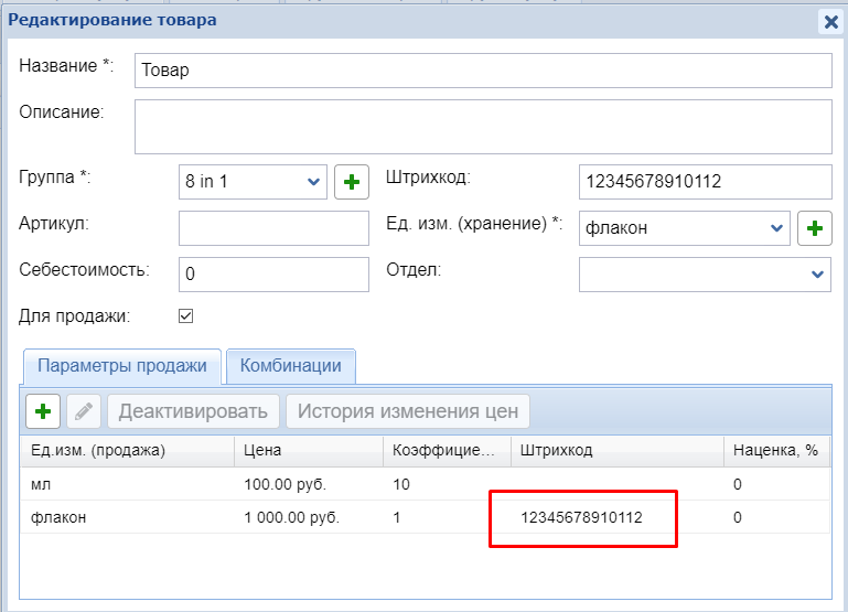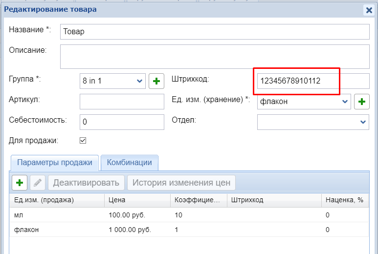 Пример: штрихкод прописан в ед. продажи - флакон.
