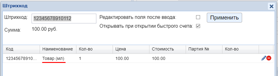 В счет по штрихкоду будет добавляться первый заведенный параметр продажи - мл: