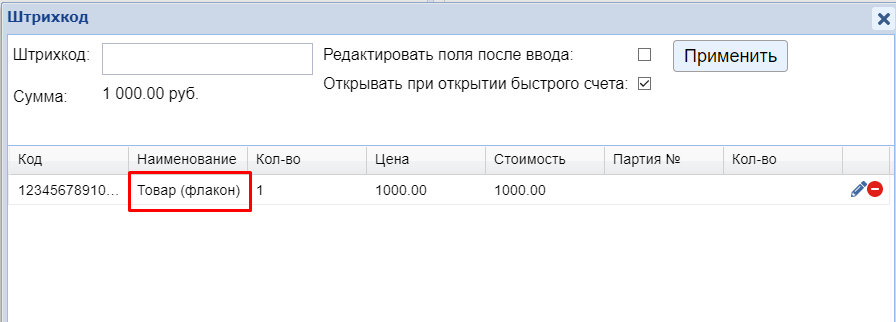 В счет по штрихкоду будет добавляться флакон.