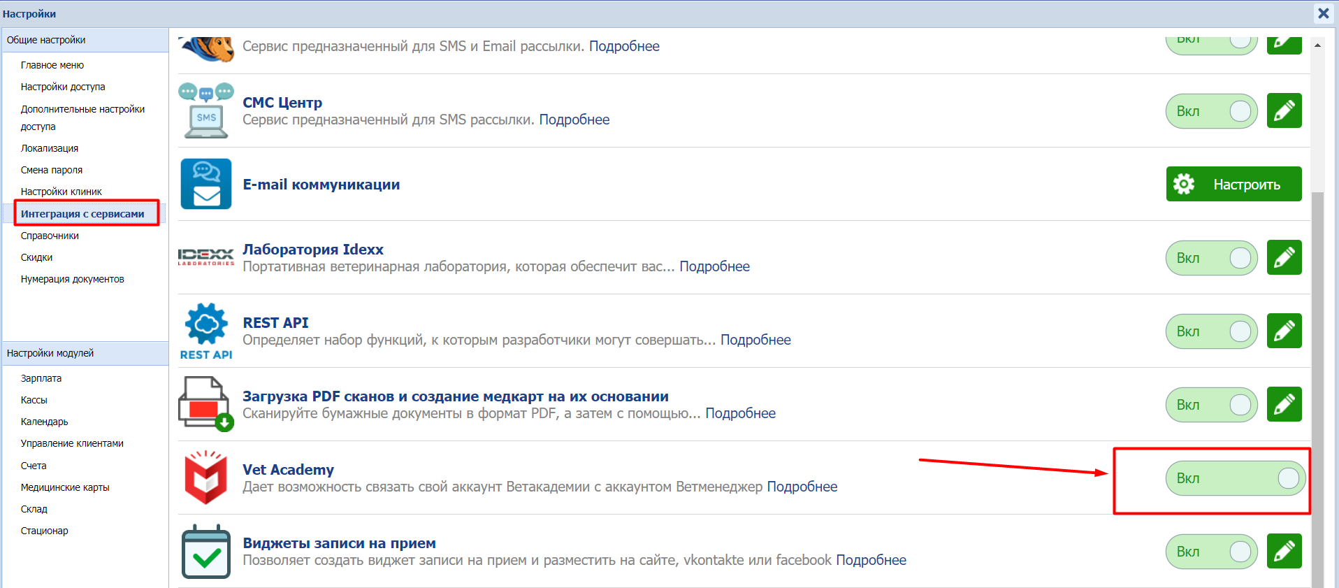 В Ветменеджере перейдите в Настройки — Интеграция с сервисами — Vet Academy — включите интеграцию и закройте настройки