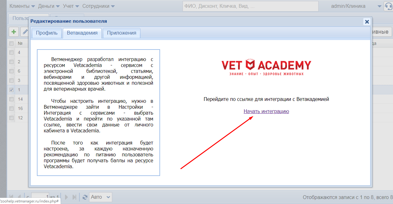 Нажмите Начать интеграцию и нужно будет войти в кабинет ветакадемии.