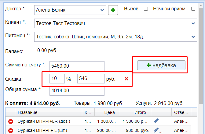 Чтобы сделать скидку/надбавку на весь счет, необходимо нажать на соответствующую кнопку. Откроется строка, куда можно вписать процент или сумму скидки/надбавки. Она будет применена к общей сумме счета.