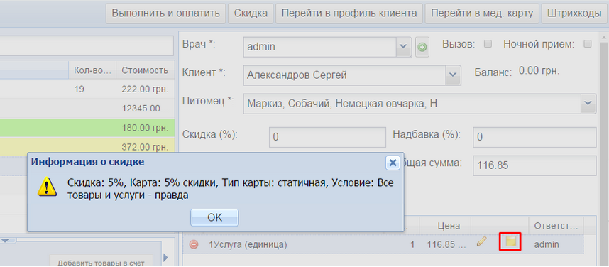 Если у клиента есть скидочная карта, то она применится автоматически (будет использоваться дисконтная карта, настроенная по умолчанию — в профиле клиента, вкладка Скидки, галочка на дисконтной карте — по умолчанию). Если же дисконтных карт у клиента несколько или скидочная карта настроена не по умолчанию, то при добавлении счета нужно нажать кнопку Скидка.