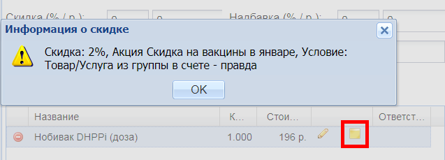 Если условия правил соблюдены, цена товаров/услуг будет с учетом скидки. Напротив позиций в счете появится желтый квадрат, нажав на который можно будет узнать подробную информацию по скидке.