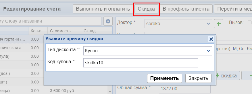 Чтобы использовать в счете купон, нужно нажать кнопку Скидка. Далее указать причину скидки, код купона и нажать кнопку Применить.