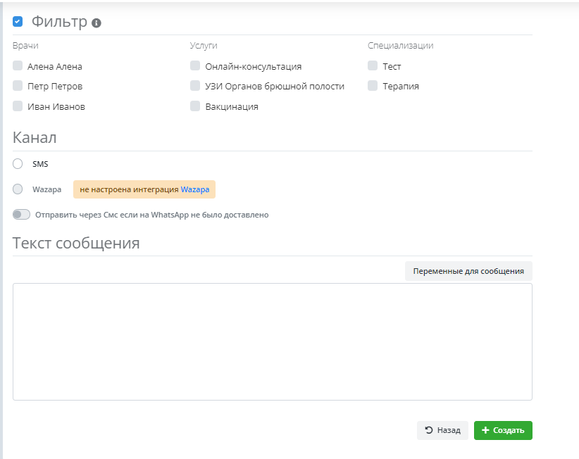 Далее можно включить Фильтр, если нужно настроить уведомления только на конкретных сотрудников, специализации, услуги. Например, если нужно отправлять сообщения при записи только на определенного врача, услугу или специализацию, необходимо отметить их в фильтре.