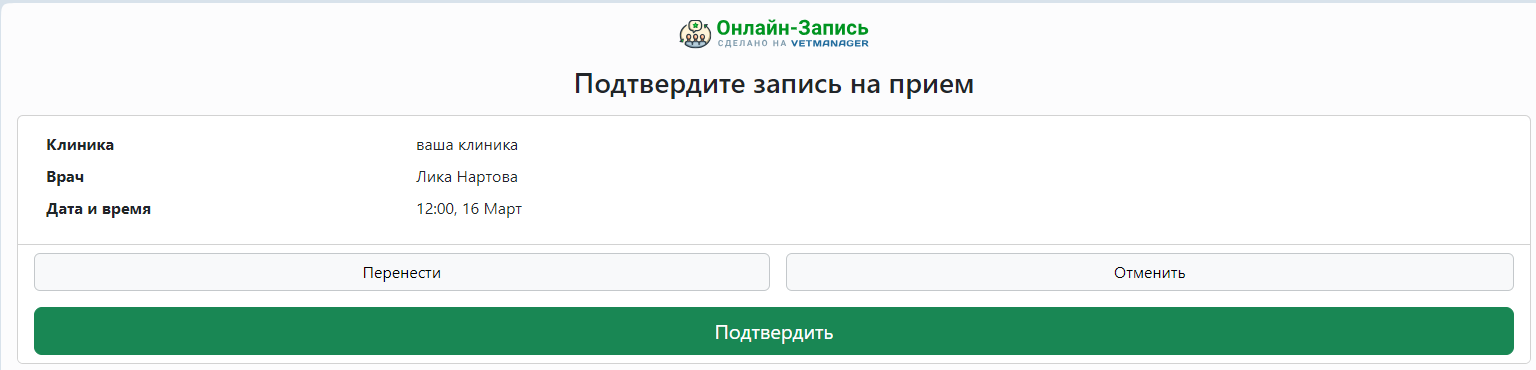 Клиент получает сообщение, в котором будет ссылка на подтверждение его записи. Он переходит по ссылке и выбирает нужный вариант: подтвердить, перенести или отменить запись.