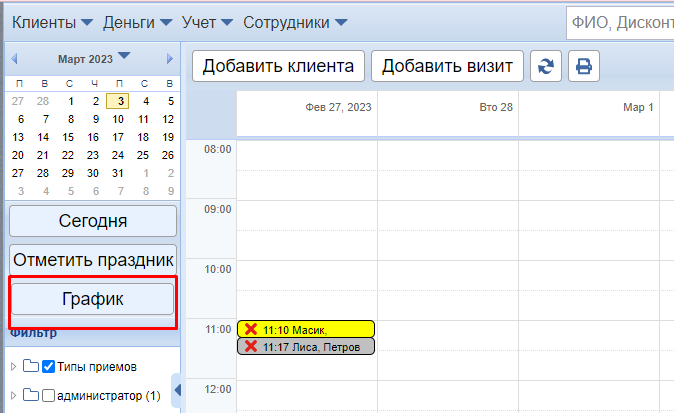 Чтобы заполнить график работы сотрудников, необходимо зайти в Сотрудники — Календарь и нажать кнопку График.