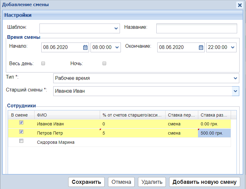 7. В разделе Сотрудники выбираются пользователи, которые также работают в этот день в эту смену. При выборе сотрудника подтягивается его ставка за смену и % от счетов старшего, если это указано в настройках зарплаты.