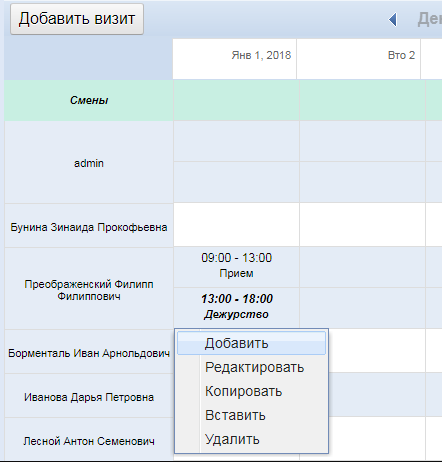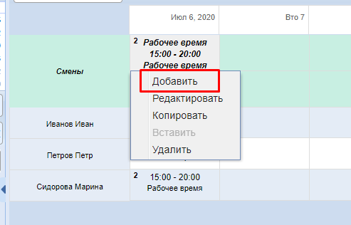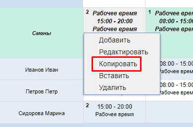 Чтобы скопировать смены, нужно кликнуть мышкой по смене и выбрать Копировать. Далее поставить мышку в нужный день в строке Смены, кликнуть правой кнопкой и выбрать Вставить.