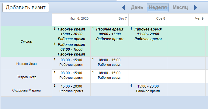 Каждая строка – это рабочий персонал (выбран в настройках во вкладке Настройки отображения и отсортирован в том порядке в котором указан во вкладке Сортировка врачей), колонки – это дни недели.