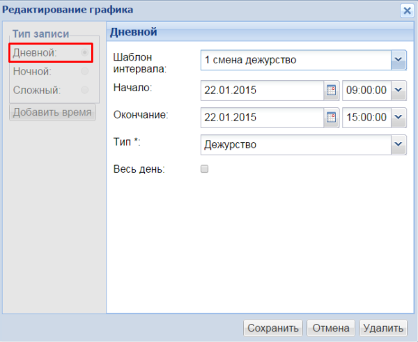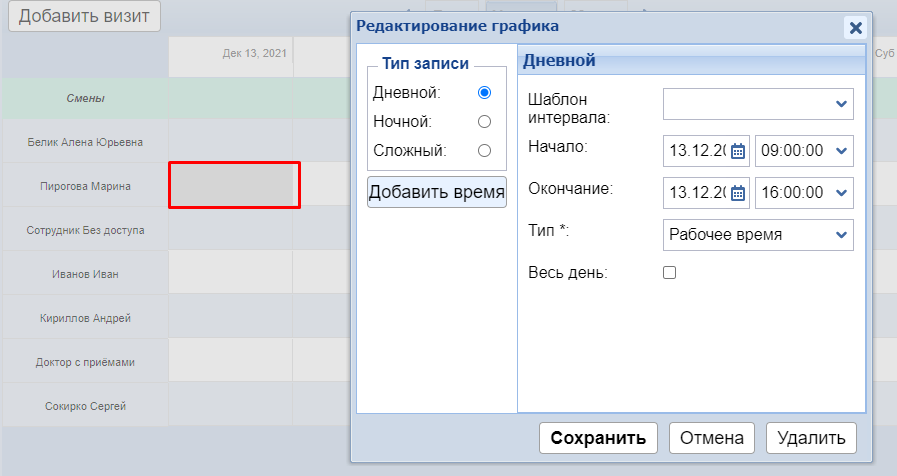 1. Если у врача дневная рабочая смена – галочку необходимо поставить на Дневной тип, выбрать один из шаблонов или указать время начала и окончания, указать тип и при необходимости действие.