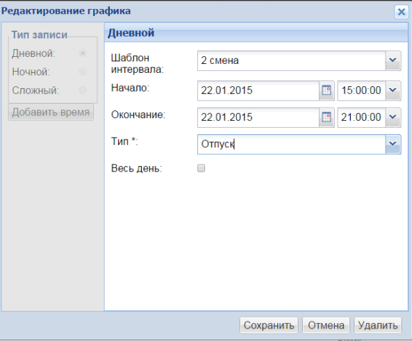 5. Тип — здесь выбирается тип рабочего времени (Настройки — Календарь — Типы интервалов).
