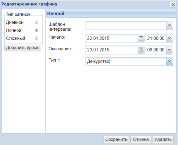 3. Врач работает в ночную смену – галочку поставить на Ночной тип, обязательно выбрать тип интервала (справочник типов интервалов можно пополнить в настройках: Настройки — Календарь — Типы интервалов).