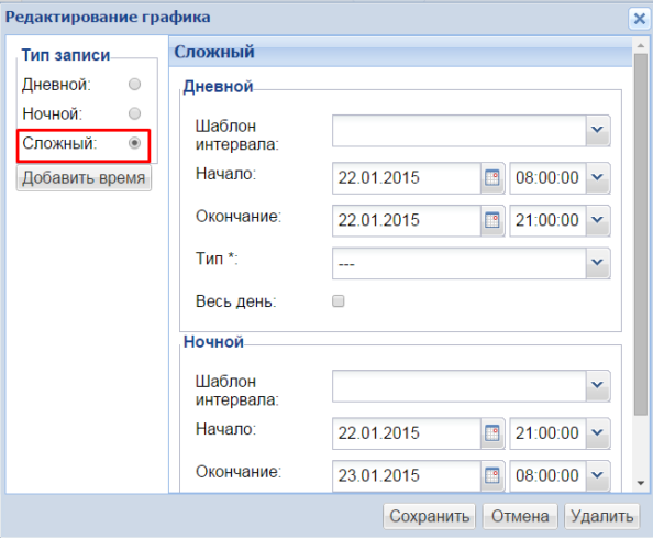 4. Рабочее время врача состоит из двух типов интервалов времени разного типа (например, у врача днем прием, а вечером он остается на дежурство) – галочка стоит на Сложном типе, затем нужно указать дневной интервал и ночной интервал времени, а также указывается тип.