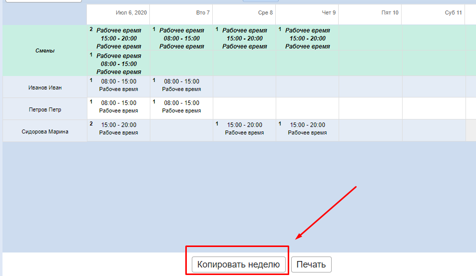Есть возможность копировать график недели (пн-вс) или копировать рабочий график одного дня.
