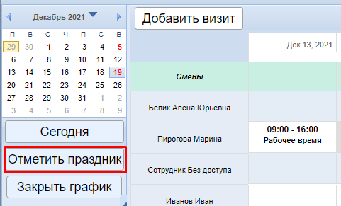 Чтобы отметить праздничные дни, нужно под календарем, расположенном в левой части экрана, нажать кнопку Отметить праздник. Затем мышкой кликнуть на день, который считается праздничным (шрифт станет красного цвета) и нажать кнопку Отметить праздник.