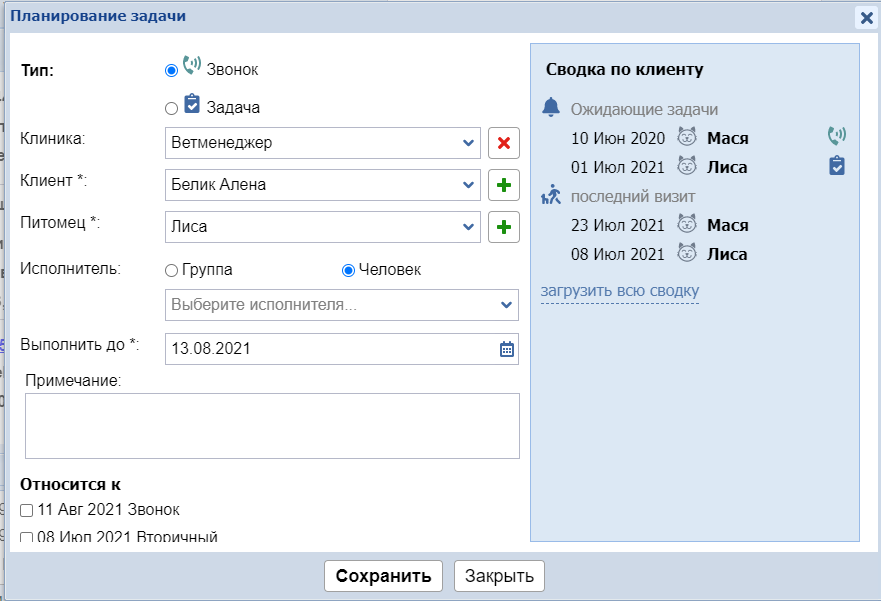 Чтобы запланировать звонок клиенту, нужно нажать на кнопку с изображением календаря. Выбрать Запланировать задачу. Эта кнопка есть в профиле клиента, в медкарте, в модуле Управление клиентами.