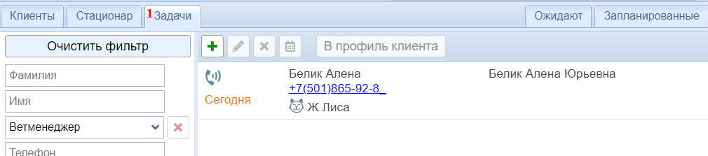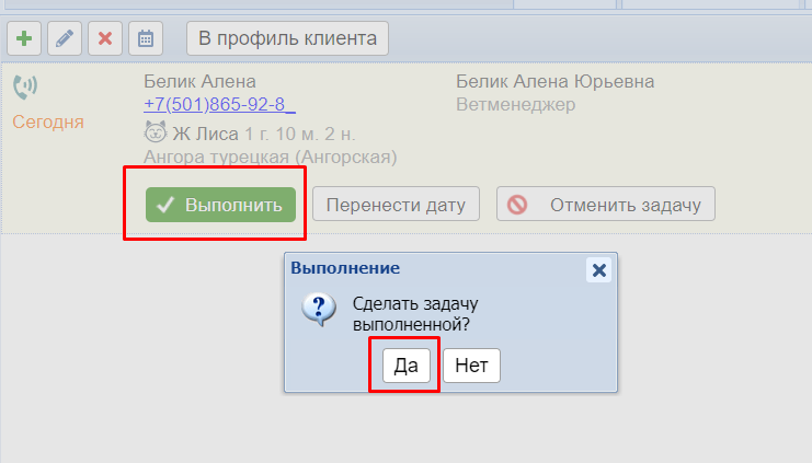 Чтобы прозвонить клиенту и отметить звонок выполненным, нужно кликнуть по строке.