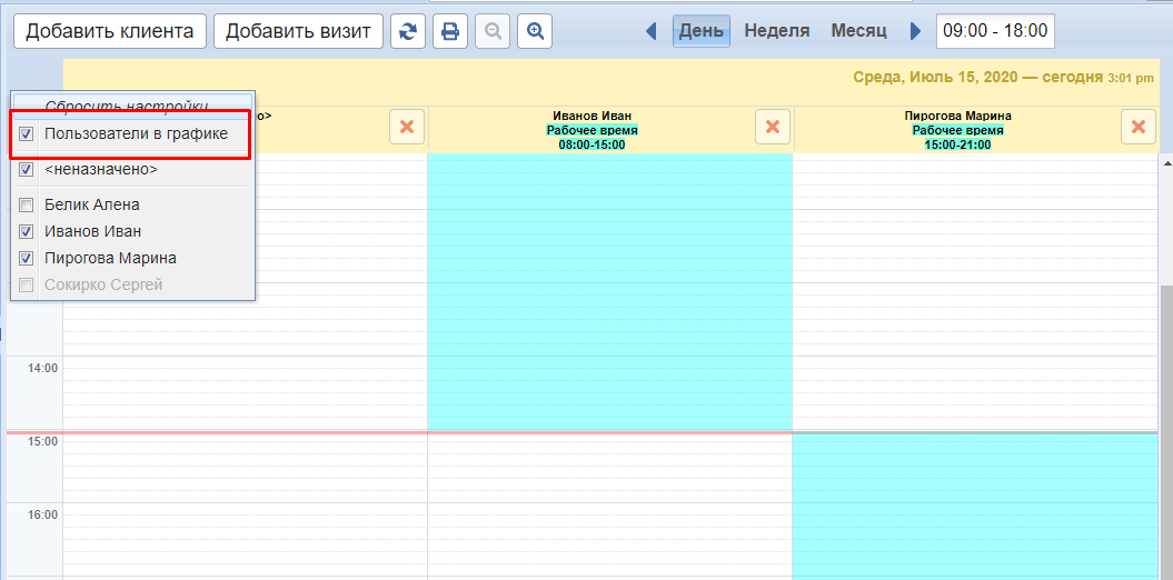 Переходим в модуль Календарь — отображение на День. Рекомендуем выставить там Пользователи в графике, чтобы были видны только те сотрудники, которые работают в это время.