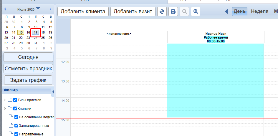 Для начала нужно завести график работы врачей, чтобы при планировании приемов в календаре наглядно было видно, у кого из сотрудников — рабочее время.